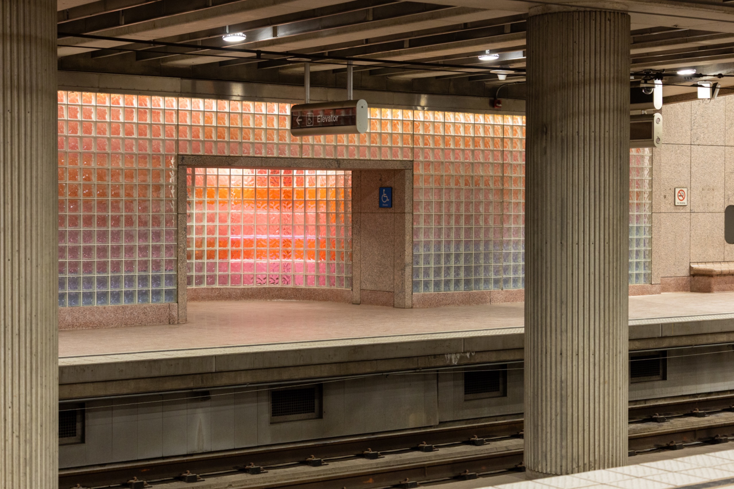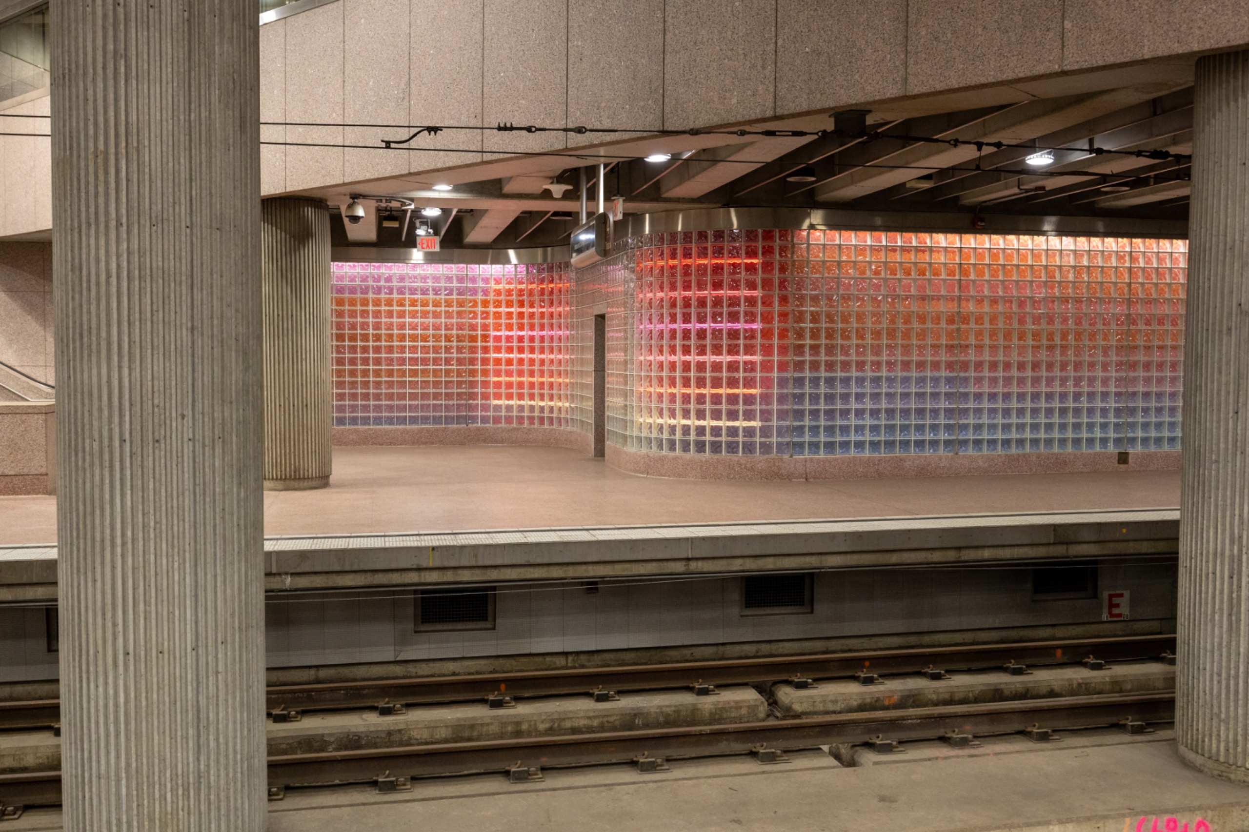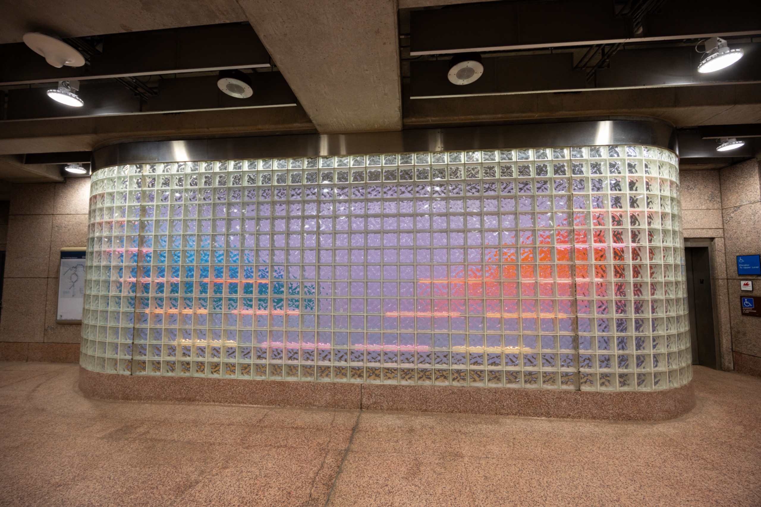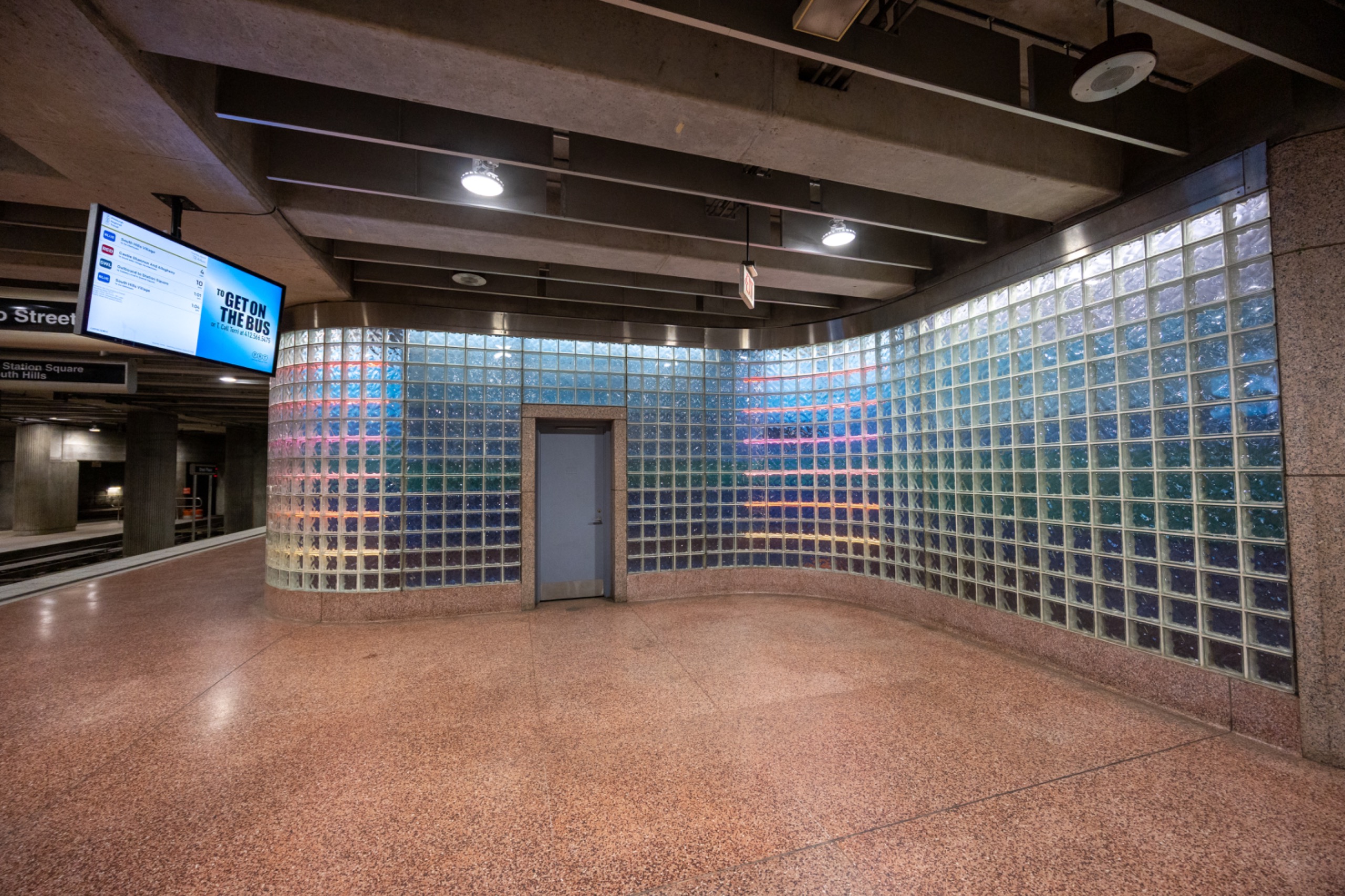 Aluminum wall panels situated behind the glass blocks are painted in a pattern designed by the artist using a palette of 15 vibrant colors. Haskell’s design responds directly to the station’s architectural features, drawing inspiration from the v-shaped platform and track alignment. Symbolizing the convergence of Pittsburgh’s three rivers at the Point, the work evokes the flowing movement of water from dawn to dusk through both color and illumination.