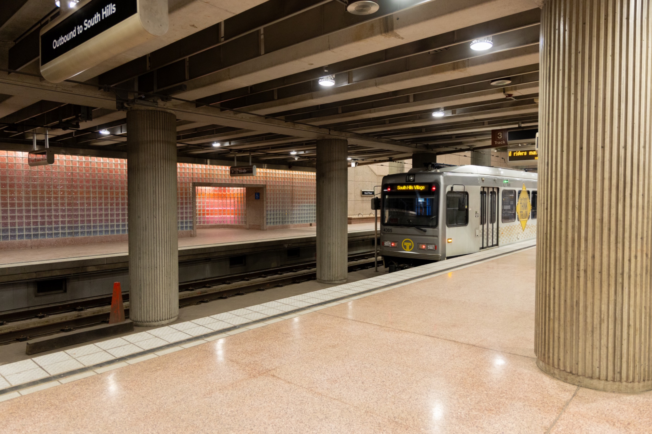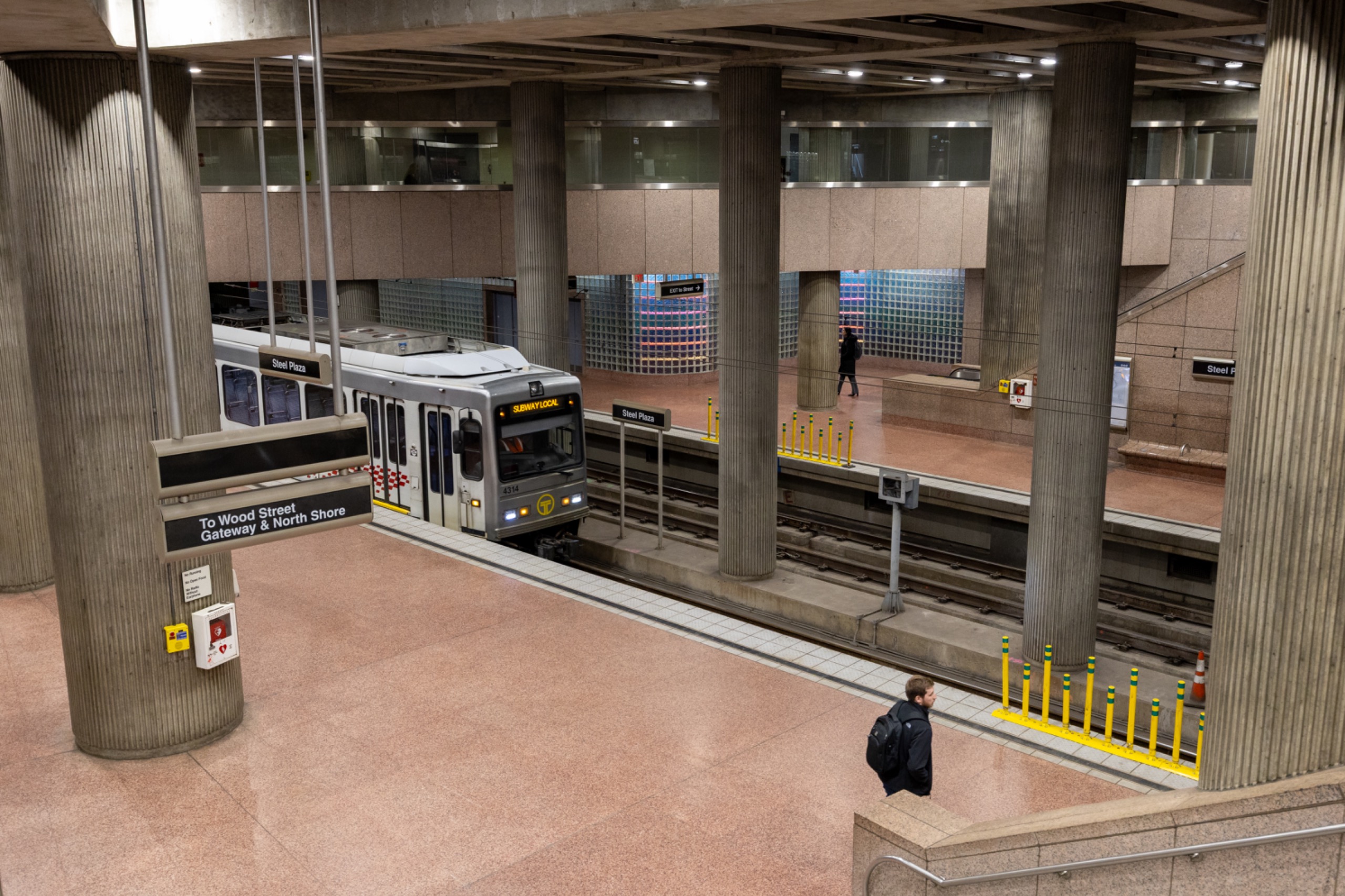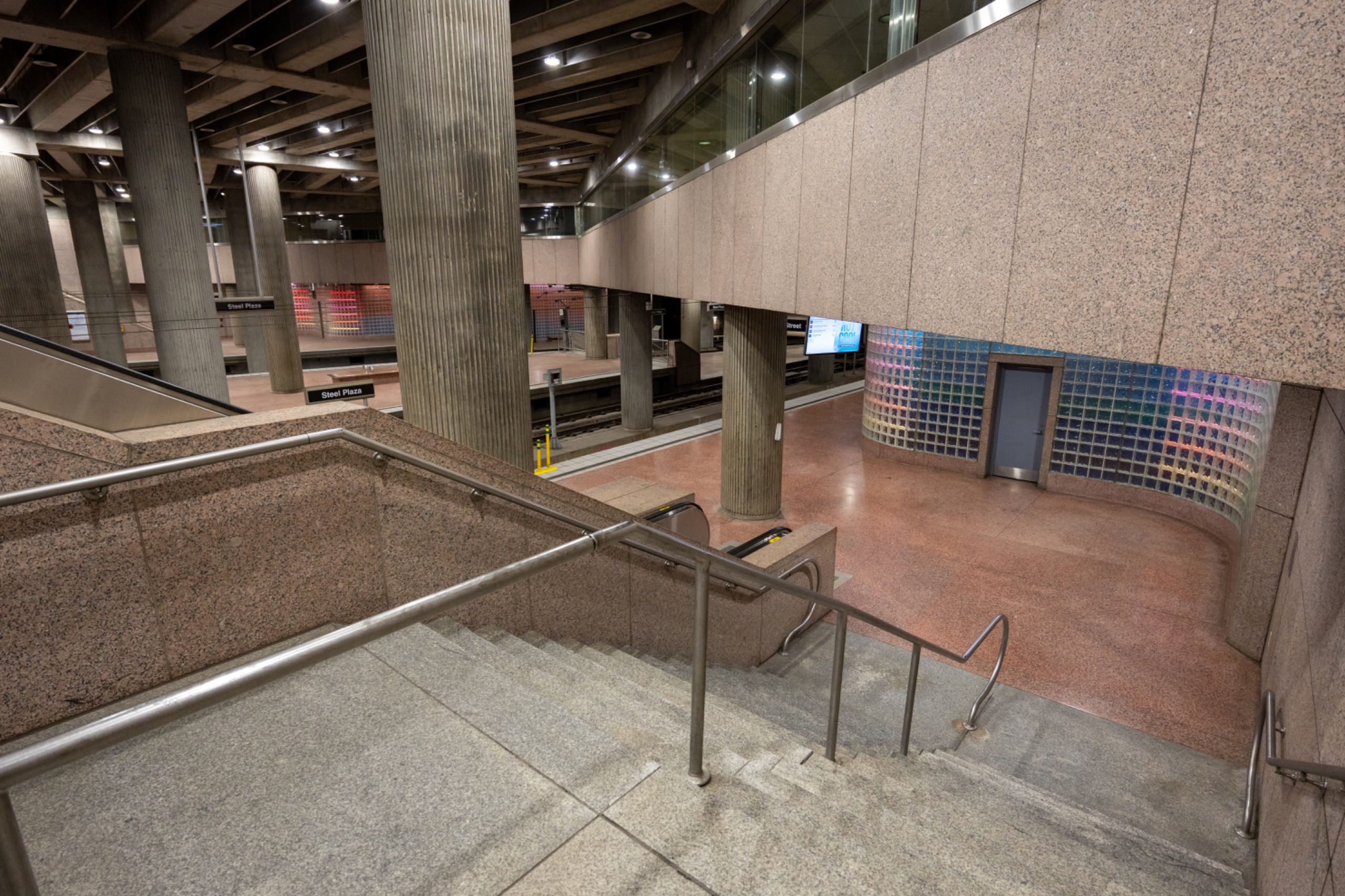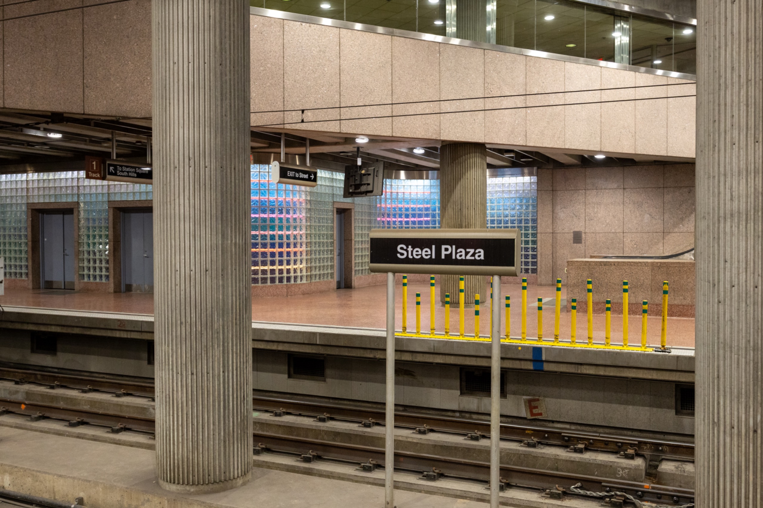 Aluminum wall panels situated behind the glass blocks are painted in a pattern designed by the artist using a palette of 15 vibrant colors. Haskell’s design responds directly to the station’s architectural features, drawing inspiration from the v-shaped platform and track alignment. Symbolizing the convergence of Pittsburgh’s three rivers at the Point, the work evokes the flowing movement of water from dawn to dusk through both color and illumination.