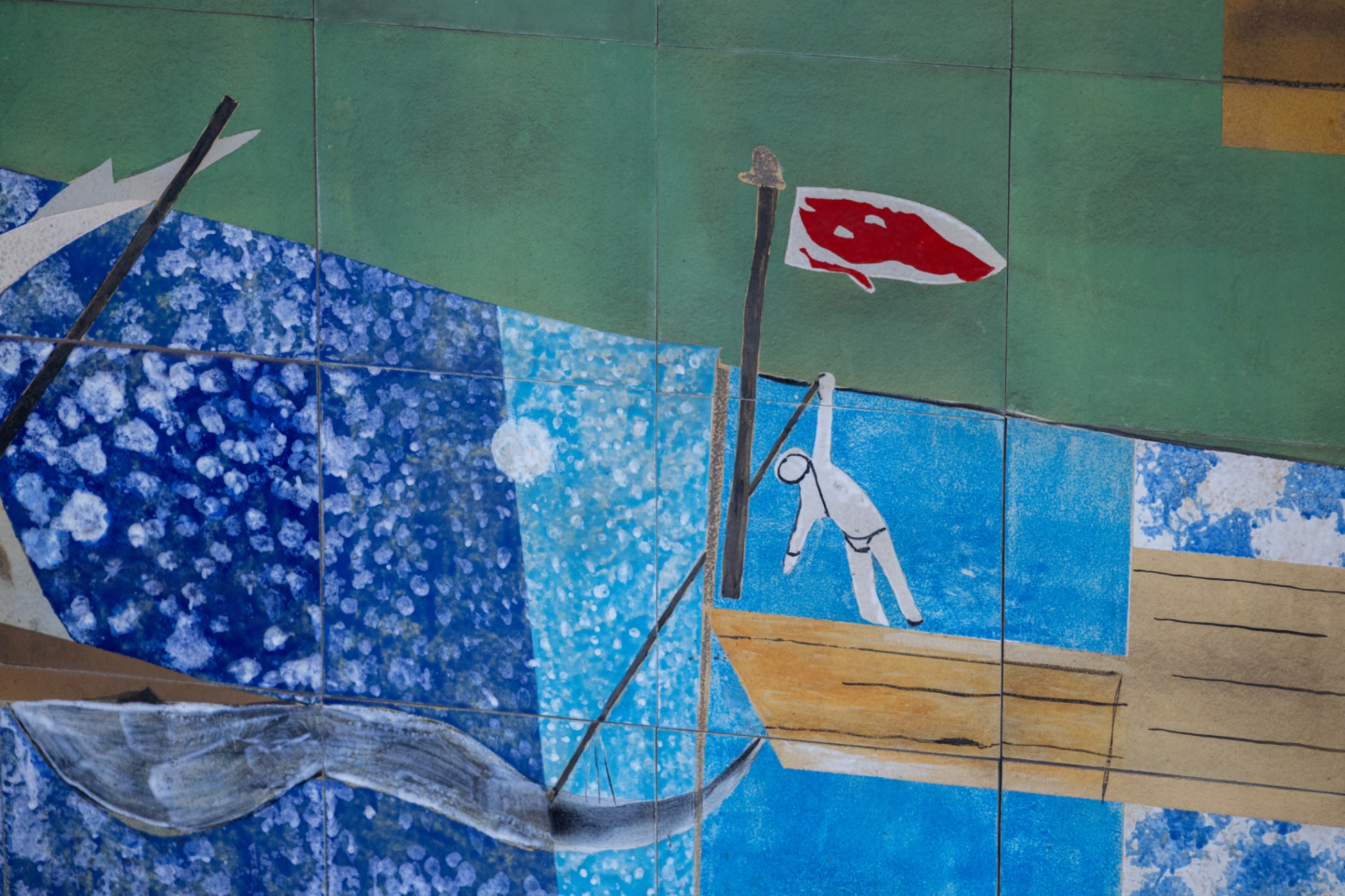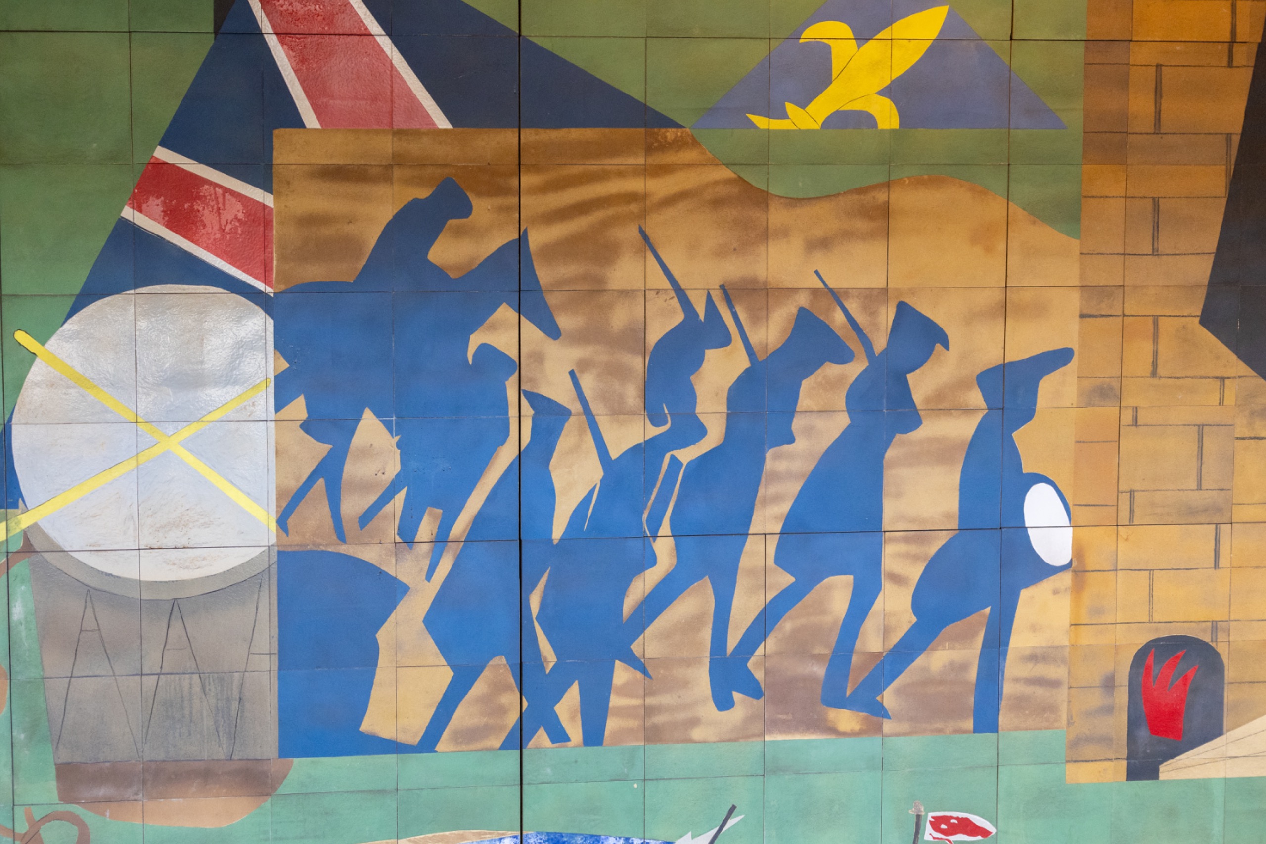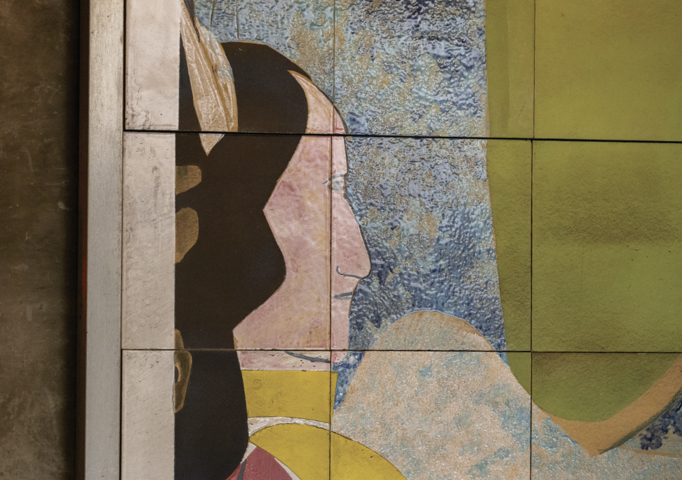 The mural is fabricated of 780 ceramic tiles, each 12 inches by 12 inches fired clay tiles was applied with glazes in the colors and patterns of Bearden’s design. Originally located in the previous Gateway Center Station, this mural was taken off the wall through a length process and adhered to aluminum backing that hangs on a cleat system here in its new location.