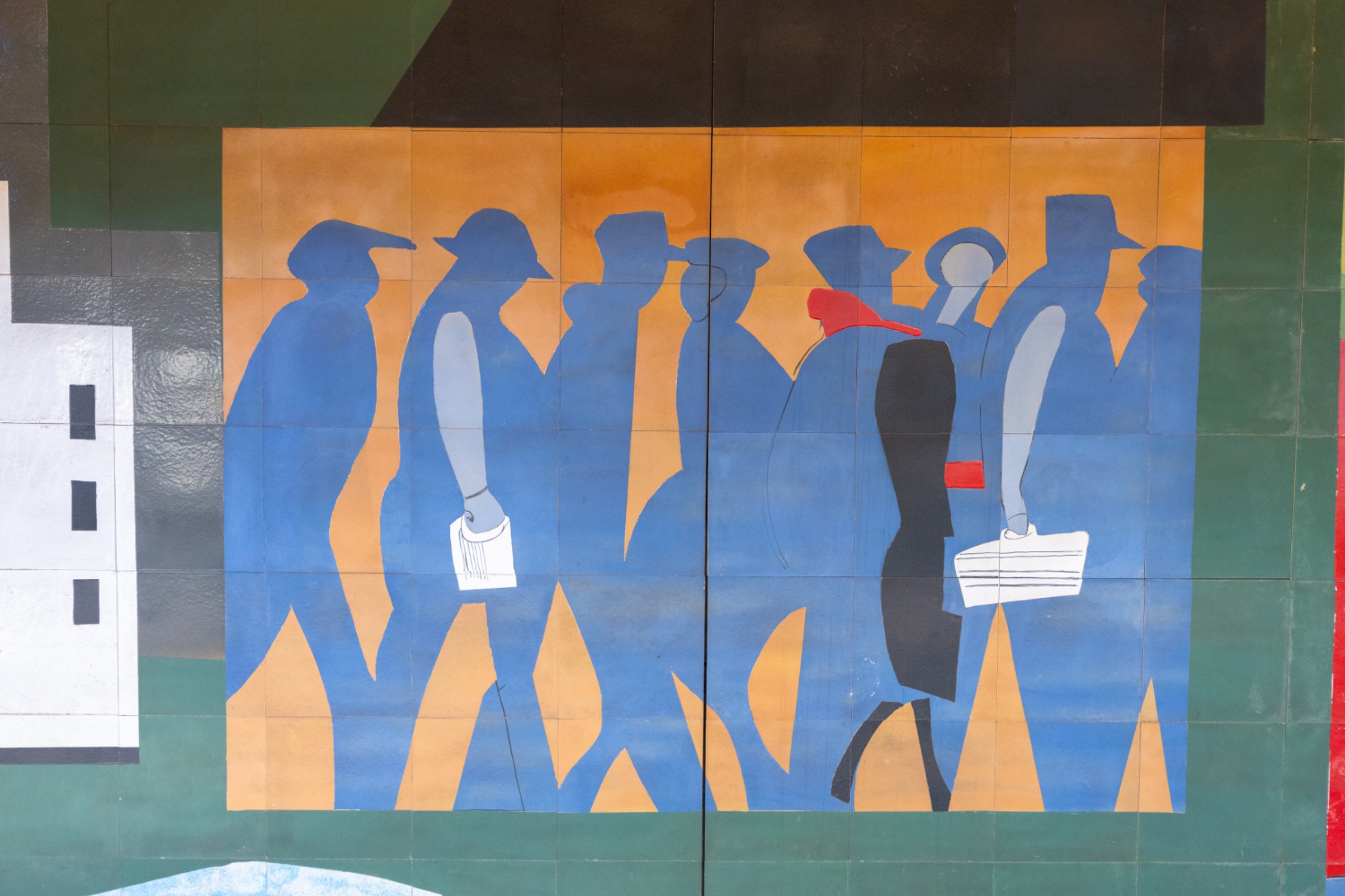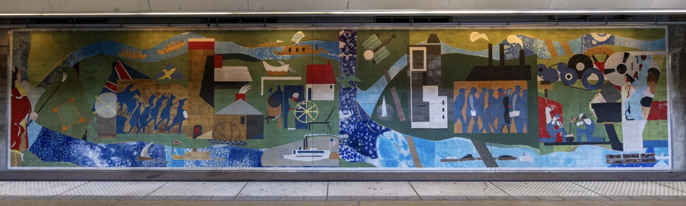 Bearden’s mural “Pittsburgh Recollections”, sixty feet long and thirteen feet high, depicts Pittsburgh’s social and cultural history and spans the wall behind the platform in Gateway Station. Located across the LRT track, the wall is the focal point of the platform level of the station.