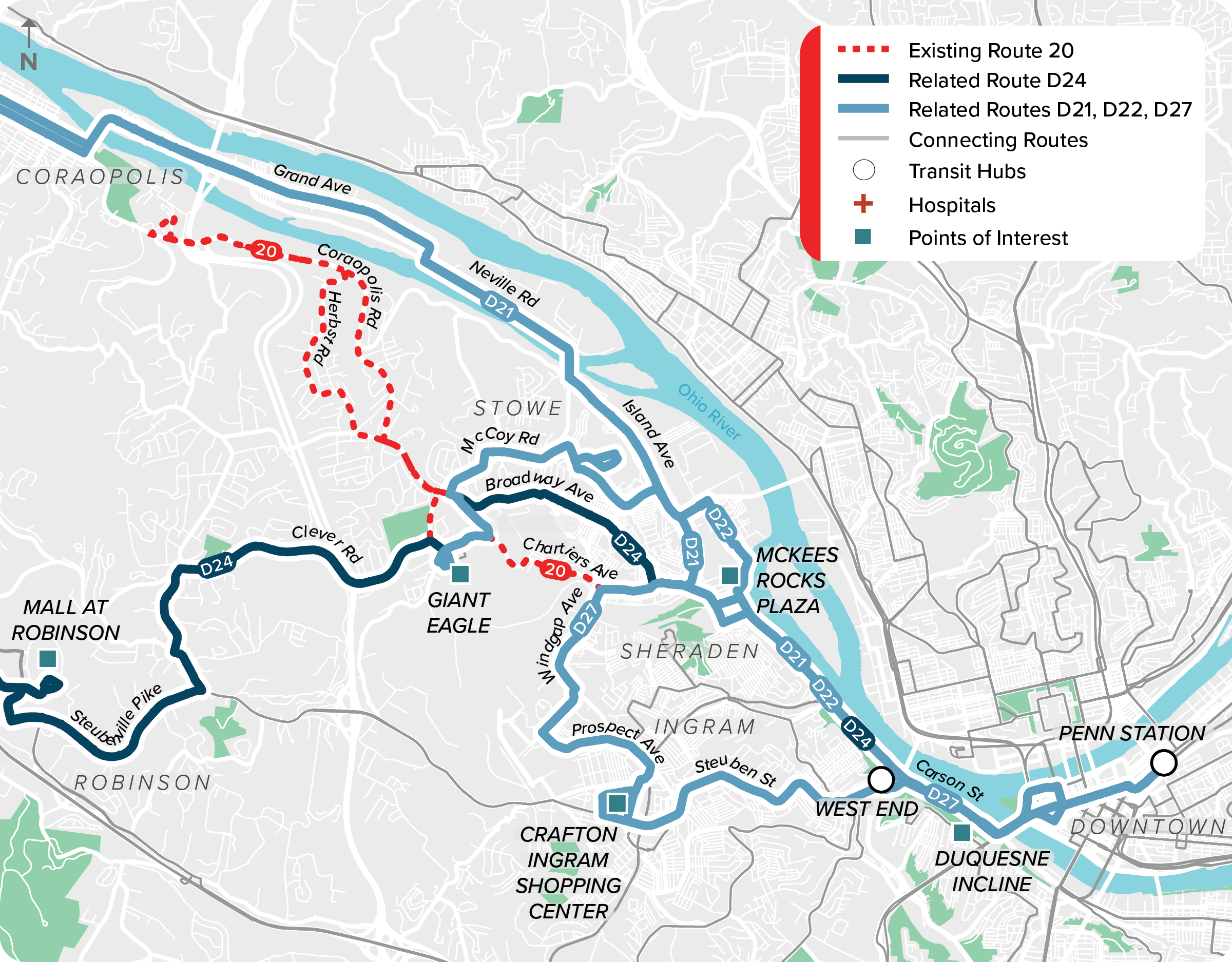 - The D22 and D24 would provide connections to Downtown and McKees Rocks.