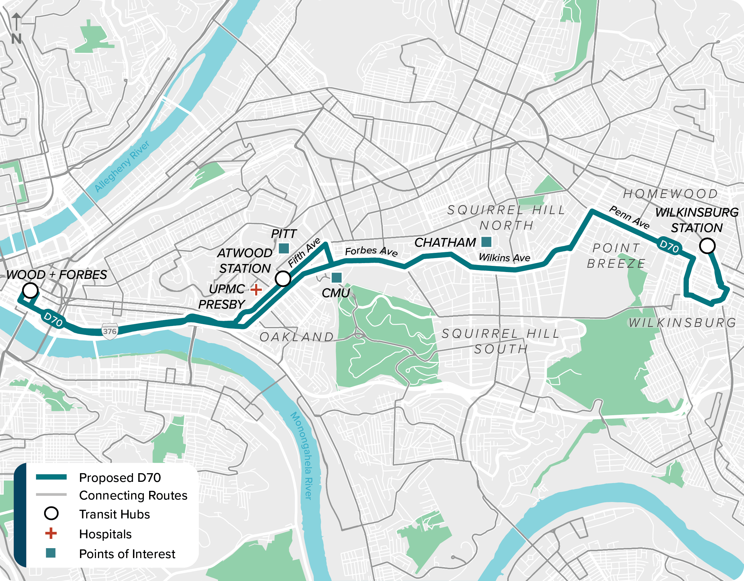 - Route D70 would follow a similar alignment to former Routes 67 and 69 between Oakland and Wilkinsburg.