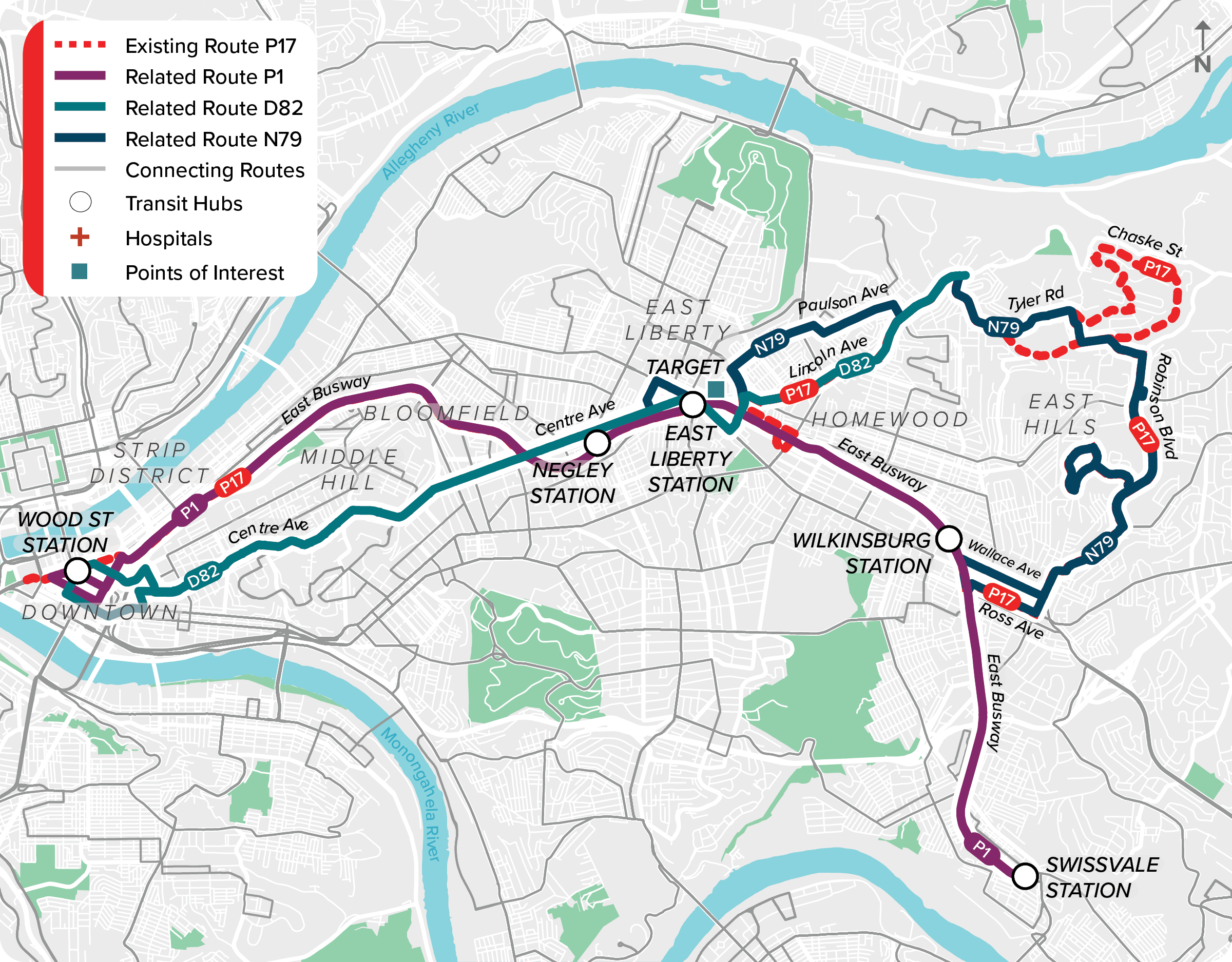 - Route N79 would provide 30 min service to the East Hills all day with connections to the East Busway.
