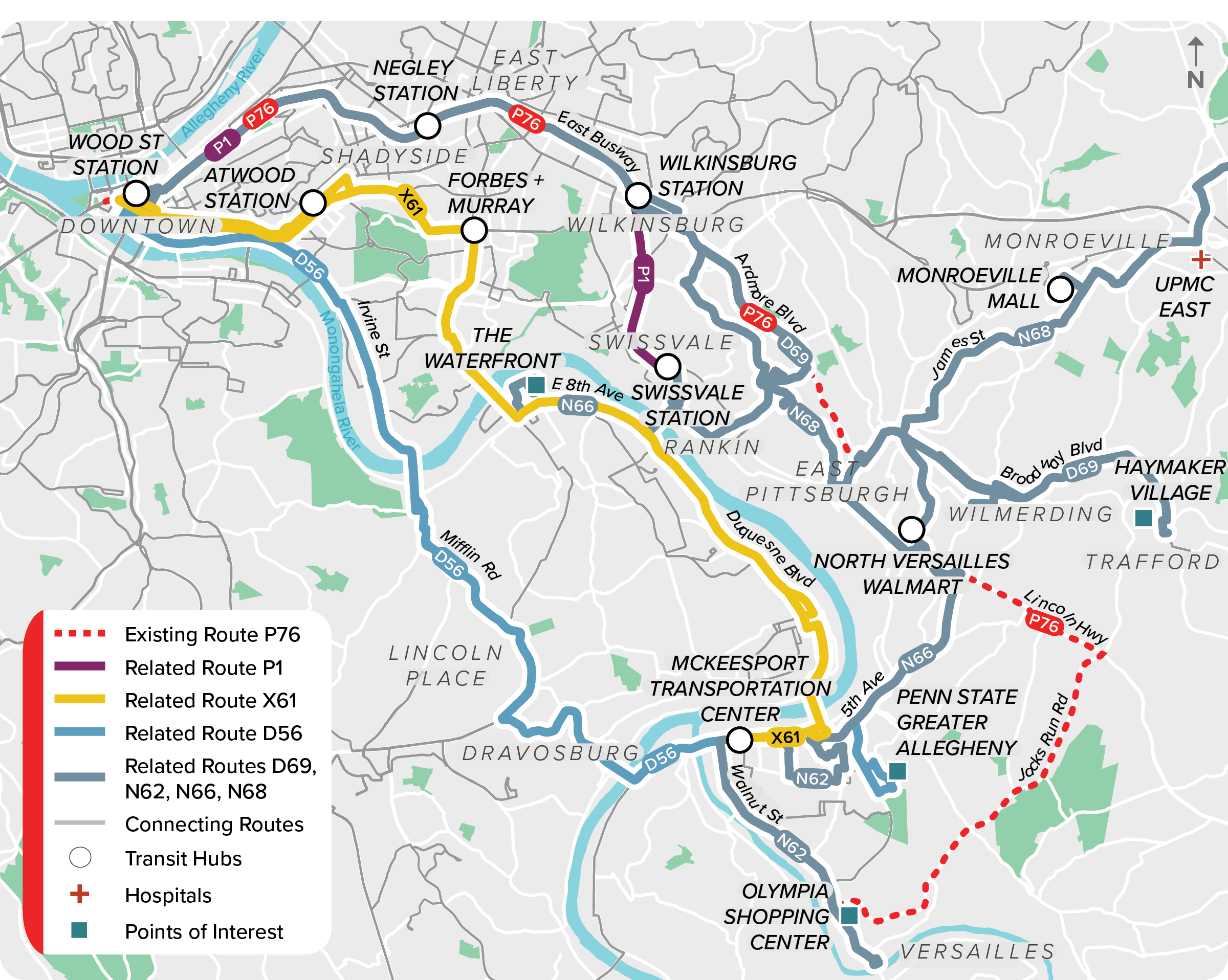 - Transfers would be available from North Versailles to Turtle Creek Valley (D69/ N69), Monroeville (N68), and McKeesport (N66).