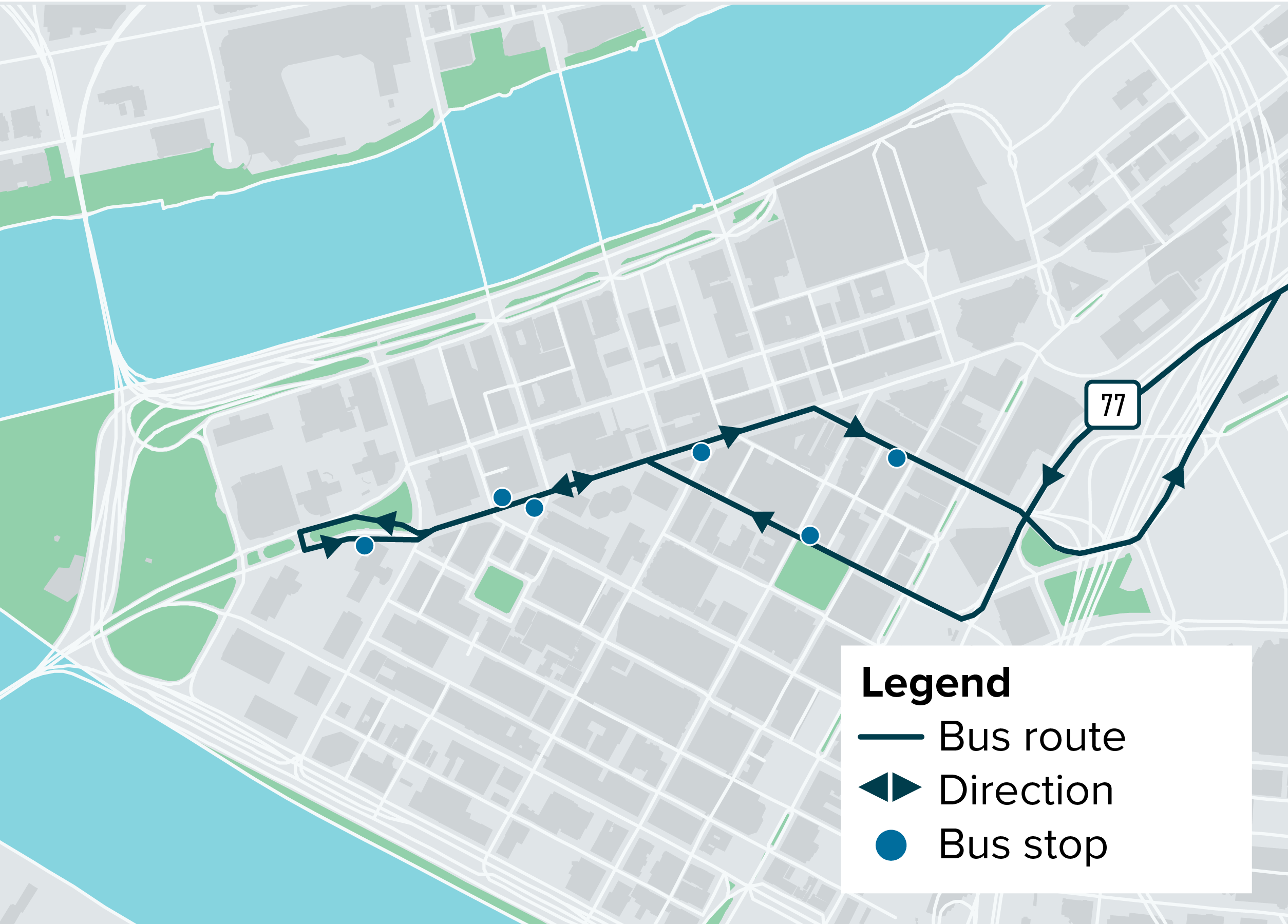 The 77 enters Downtown from Bigelow Boulevard, turns right on 6th Ave, left on Liberty Avenue, and also loops at Gateway Station. It uses 7th Ave to exit Downtown.The City of Pittsburgh’s upcoming Reimagine Smithfield Project will impact PRT bus routes using Smithfield, and PRT is coordinating with the Department of Mobility and Infrastructure (DOMI) to put some routes on long-term detours to minimize disruption to riders. Those changes will be communicated in advance to riders with route and stop level information.